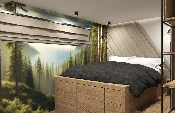 Спалнята е решена в същия стил като останалите помещения. Настилката прелива от дневната към спалнята и съответно следва същата диагонална линия. Етажерката има същия дизайн като тази в хола. Леглото е повдигнато върху подиум, до който се стига посредством едно прибиращо се стъпало. В подиума са заложени чекмеджета за съхранение на дрехи. Гардеробът с огледални врати отразява отсрещната стена с тапет с пейзаж, което прави стаята визуално по-просторна. От вътрешната страна на леглото, в матрачната рамка е изработена ниша за вещи.