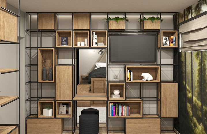 Апартаментът се обитава от студент Предпочетена е неутралната цветова гама и светлото дърво. Стилът е съвременен градски. Характерни за интериора са мебелите за съхранение с конструкция от метални профили и кубични модули.