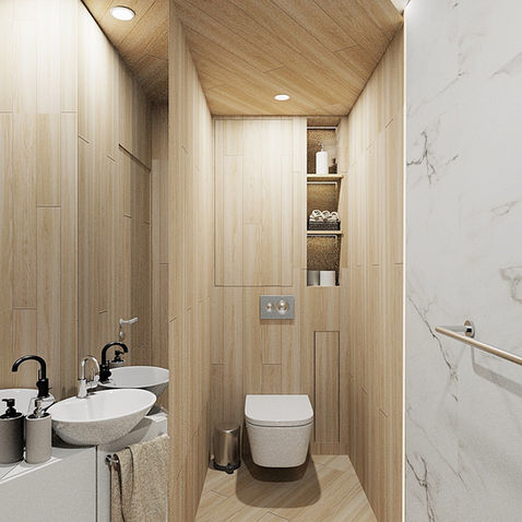 Пространството за санитарното помещение е дълго и тясно, като вратата е разположена посредата на дългата стена. Тоалетната чиния и душ кабината са ситуирани една срещу друга. Облицоването с гранитогрес е под асиметрична форма, която обхваща трите измерения на помощението. Мивката и шкафовете са ъглови.